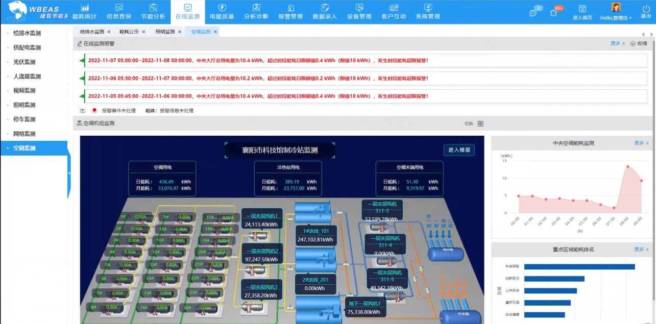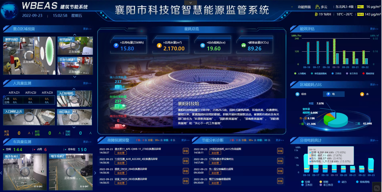 襄阳市科技馆新馆总建筑面积35268㎡,其中地上建筑面积26468㎡,地下建筑面积8800㎡,展教面积约20000㎡,属国家特大型科技场馆。为响应国家和省节能主管部门有关公共建筑机构节能管理的精神,提高襄阳科技馆能源管理信息化水平,经公开招标,引进今年会金字电气WBEAS建筑智能优化节能系统,该项目于2022年3月初开始建设,5月底完成系统上线运行和验收。