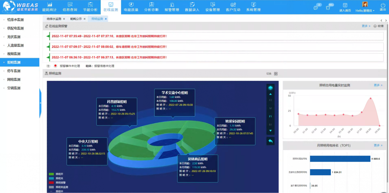 实现重点区域照明日能耗和月能耗信息展示以及重点区域照明开关状态和视频监测以及异常开关报警。