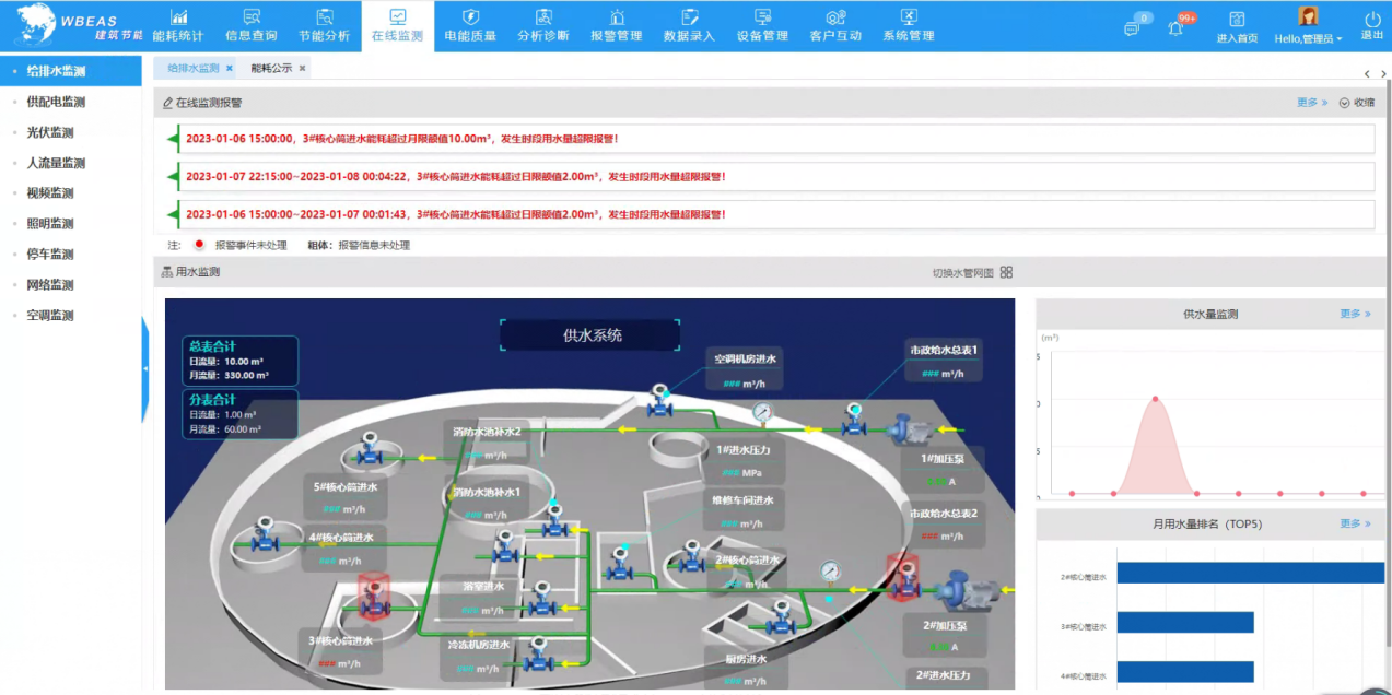 实现给排水管网图3D展示,给排水设备运行状态(电流、功率)展示,设备档案(设备型号、额定电流、额定功率)展示和各个排水区域水位、供水水压信息展示;水泵房内人员行为(人员异常进入,违规操作设备)异常报警。