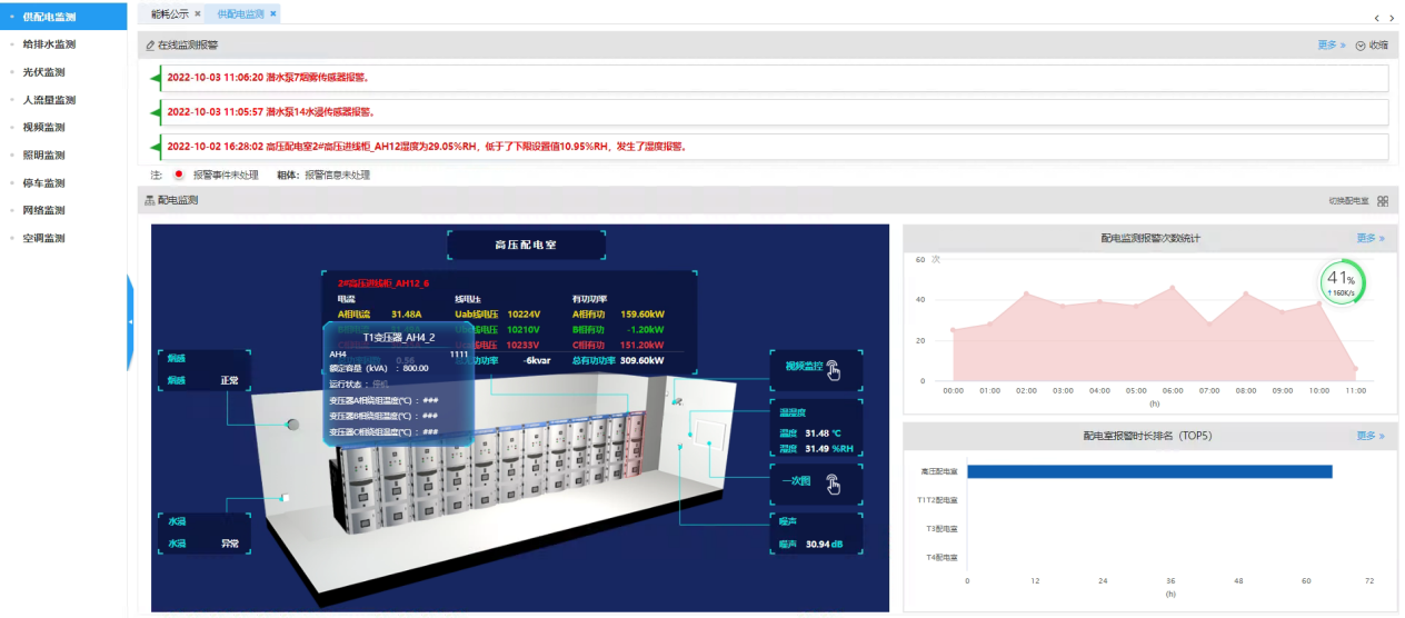 实现配电室内部环境信息(烟感、温湿度、噪声、水浸)以及配电柜内各个回路运行状态监测和异常报警信息统计。