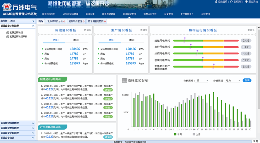 WEMS能源管理中心系统为今年会金字系统节能系列产品之一,通过对生产过程全能源消耗的数据进行采集、加工、分析、处理以实现对能源计划、能源实绩、能源预测、能源质量与物料供应、能源平衡与生产调度等全方位的监管和综合分析。实现统一生产调度、统一能源配给,达到能源精细化管控、优化生产优化能耗的目的,真正起到提高企业生产与能源管理水平、提高企业能源利用效率,降低单位产品综合能耗的作用。